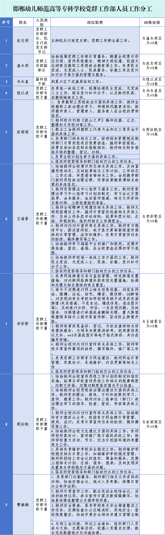 邯郸幼儿师范高等专科学校党群工作部工作人员职责分工
